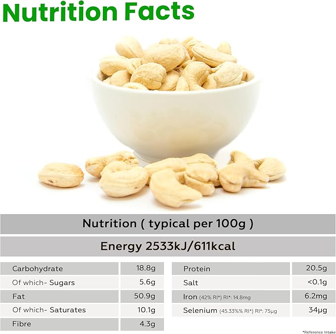 ESSENTIAL NUTRITION FACTS: Per 100g, cashews provide iron (6mg; 44% RI*), magnesium (250mg; 83.3% RI*), zinc (5.7mg; 60% RI*), selenium (34ug; 45.3% RI*), 20.5g protein, 3.2g fibre, and healthy unsaturated fats.